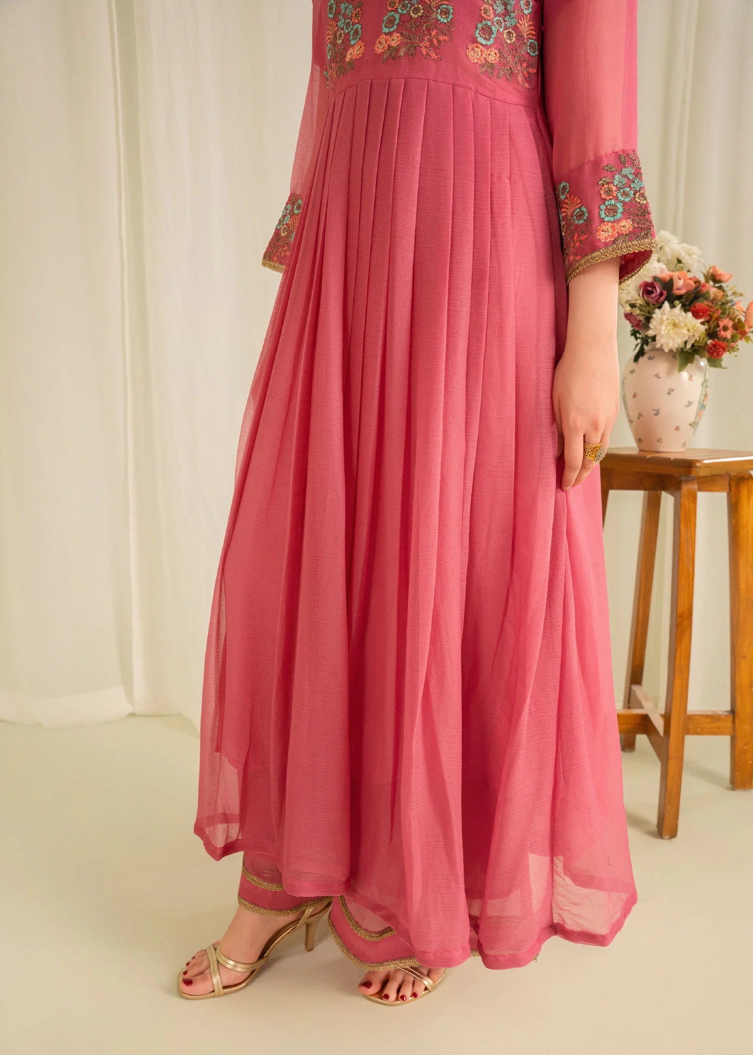 Add a touch of timeless elegance to your wardrobe with this stunning silk Anarkali maxi set, designed in a rich rose pink shade. Crafted from luxurious silk, the outfit offers a soft sheen and a graceful fall, giving it a regal and refined appeal. The bodice and sleeves are adorned with delicate multi-colored floral embroidery, adding subtle sophistication and artistic charm.